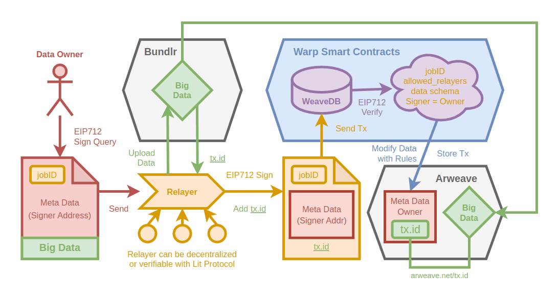 noteto Arweave using Bundlr and get thetx.idfor it, attach thetx.idas an extra piece of data, then sign it with eip712, then send the transaction to the WeaveDB contract on Warp. - The WeaveDB contract verifies the eip712 signatures and validates