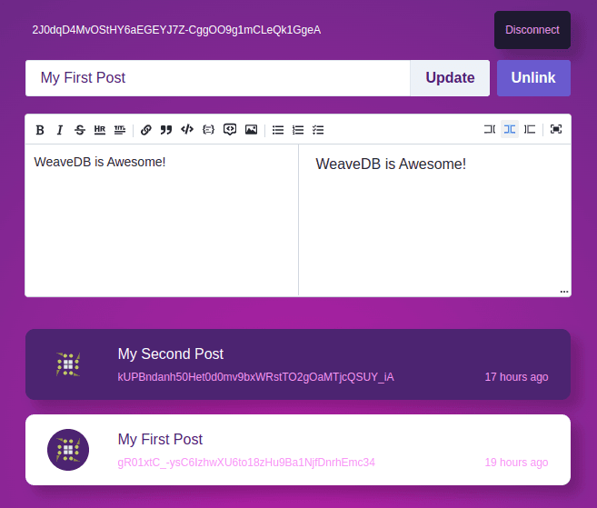For this example, we will build a simple markdown note taking dapp where you can publish notes through Bundlr (opens in a new tab) with a WeaveDB relayer.