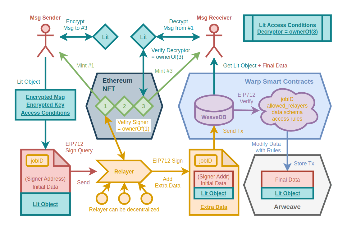 tokenIDsand add extra data (isOwner,lit,tokenIds) to the signed query, then signs it with eip712 and sends the transaction to the WeaveDB contract on Warp. - The WeaveDB contract verifies the eip712 signatures and validates