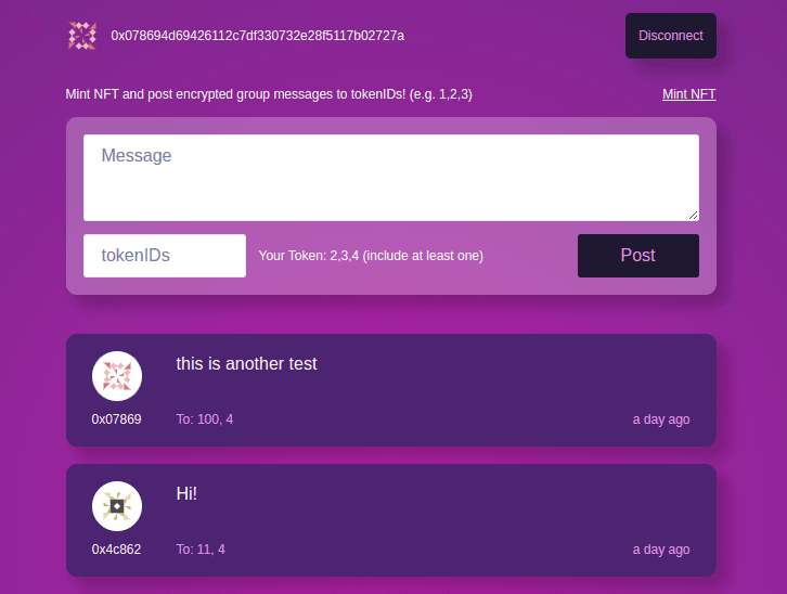 For this example, we will build a messaging dapp where you can send encrypted messages to only specified NFT holders. And only the holders of specified tokenIDs will be able to decrypt your messages.