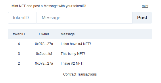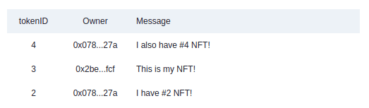 The Messages component loops through nfts and list the messages with a link to the owner page on Etherscan.